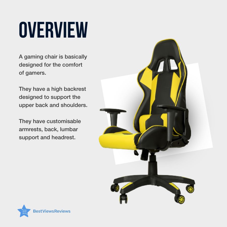 A gaming chair normally consists of multiple parts, but mainly it includes winged shoulder support, a high padded backrest, padded armrests that are adjustable, and a heavy-duty base. The heavy-duty base in most chairs allows for 360-degree rotation. You can also lift these chairs up, through the hydraulics control that you can easily find in many high-end chairs. You can also check models like LEMBERI Video Game Chairs that come with footrest which provides you more comfort.